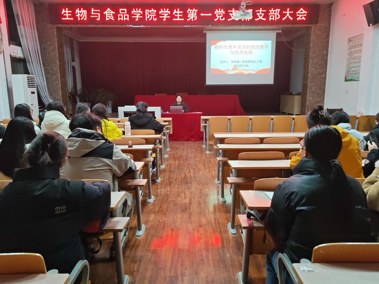 为深入学习贯彻党的二十届四中全会精神,夯实学生党员党性根基,生物与食品学院于12月8日在生物院117报告厅,面向学生第一党支部学生党员开展以“新时代青年党员的党性修养与作用发挥”为主题的专题党课,本次培训由学院学生第一党支部书记丁蓓主讲。