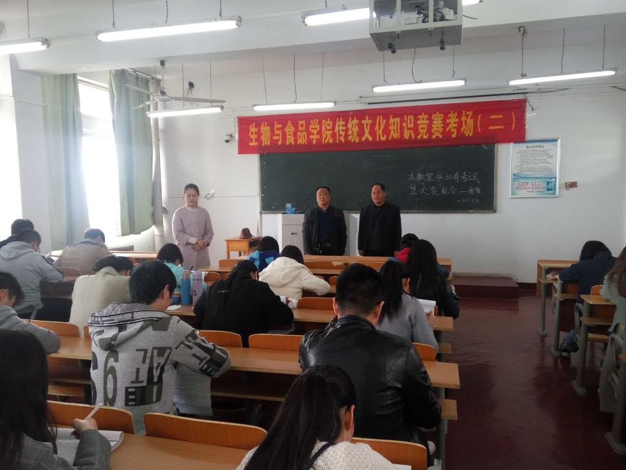 为了弘扬中国优秀传统文化,继承和发扬中华文化传统美德,吸取传统文化宝贵精神财富,提高大学生的精神文化素养。2017年3月31日下午两点半,生物与食品学院传统文化知识竞赛在一号教学楼504和505教室举行。生物与食品学院各级学生积极参加,并且辅导员老师监考了此次比赛。