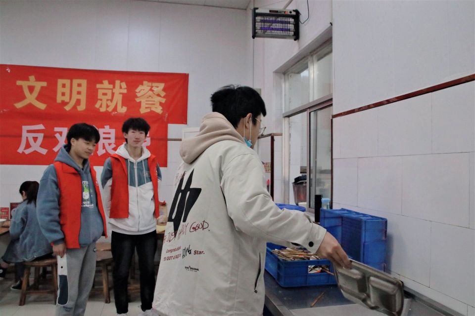 本次活动由志愿者们轮流值班,在规定时间内到食堂进行监督和引导。在活动整个过程中,每名志愿者都表现得很好。志愿者们认真服务、文明劝导,面带微笑用温馨的话语提醒在食堂就餐的同学们自觉把餐具放到回收处,同学们一个接一个地把餐具放到餐具回收处的行为充分展现了当代大学生的良好素质。同时,同学们良好的文明习惯也给食堂的工作人员减轻了许多负担。