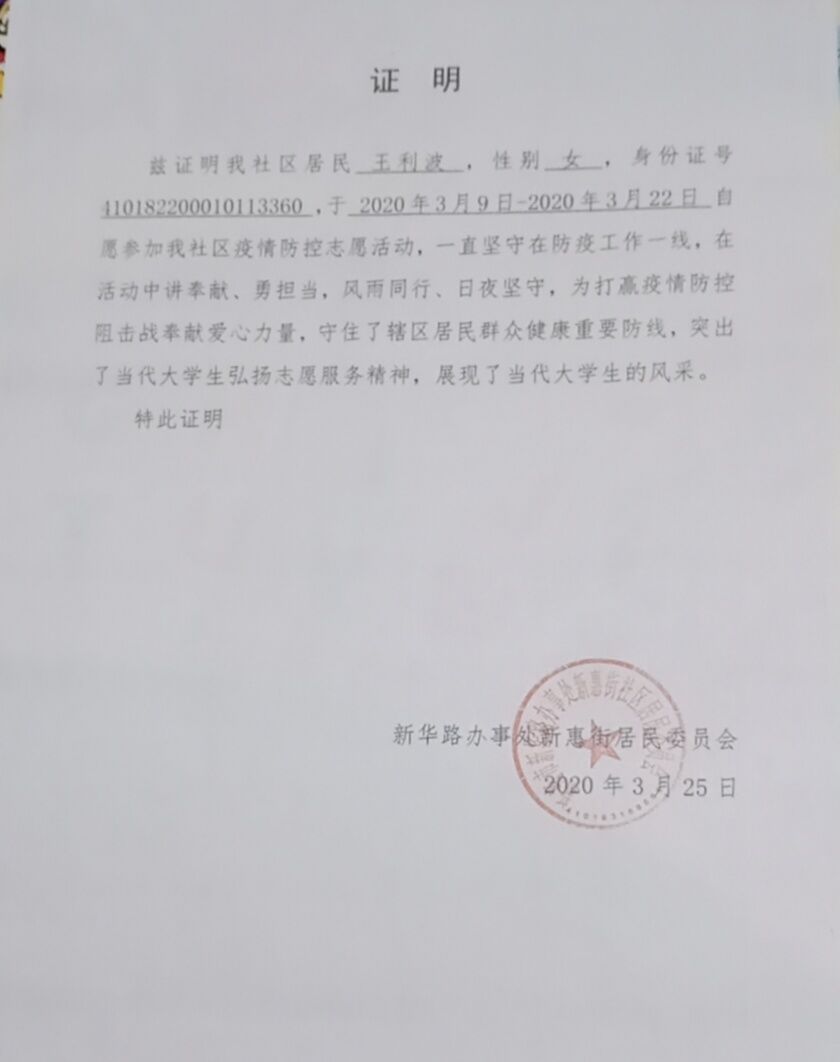 我是商丘师范学院生物与食品学院生物科学18-2班学生王利波,我于2020年3月09日到22日自愿在河南省郑州市新密市新惠街参与疫情志愿者活动。
