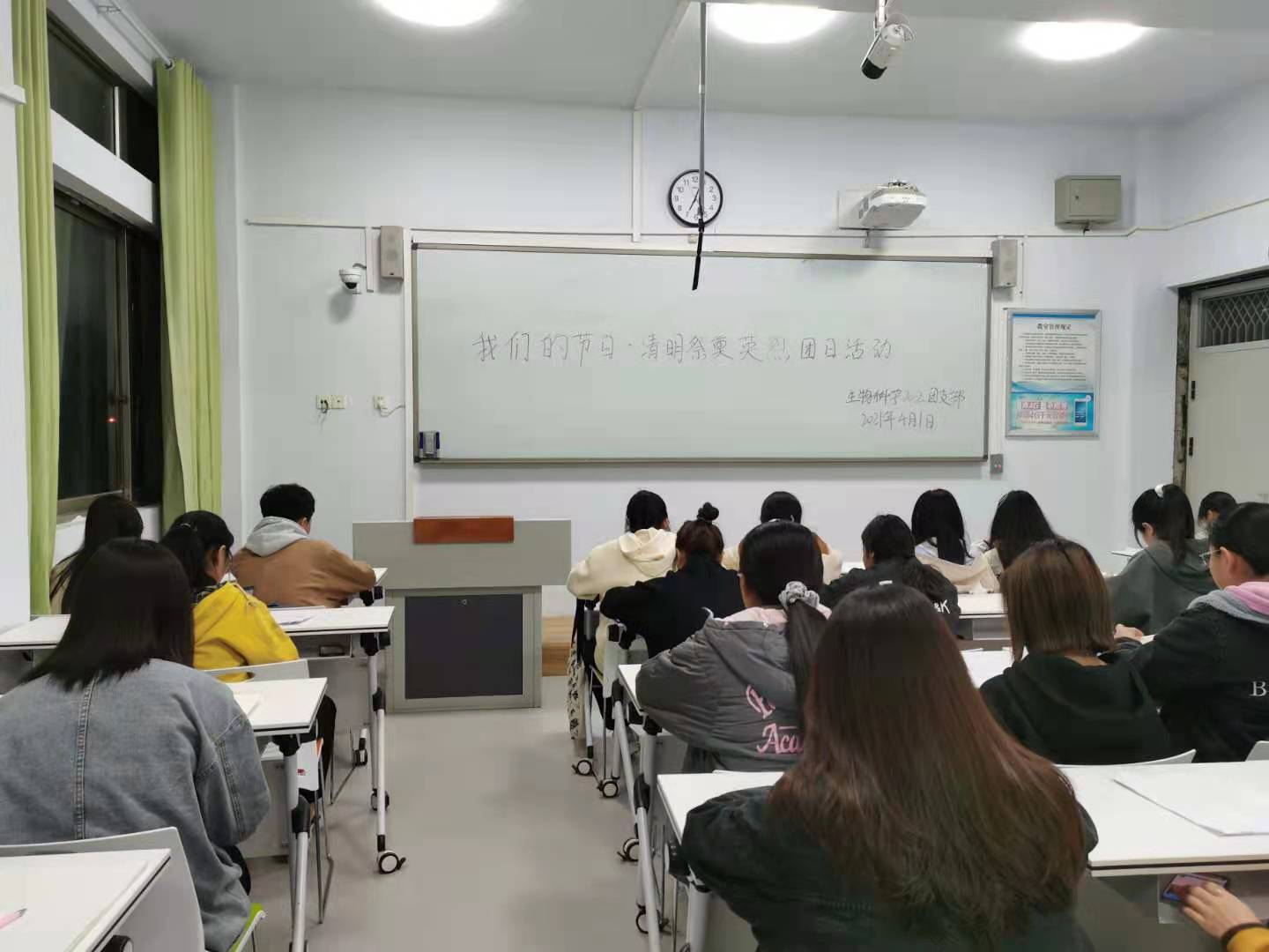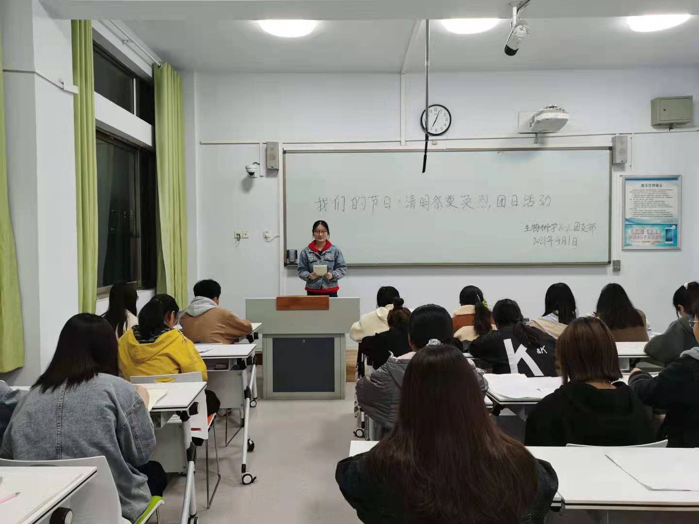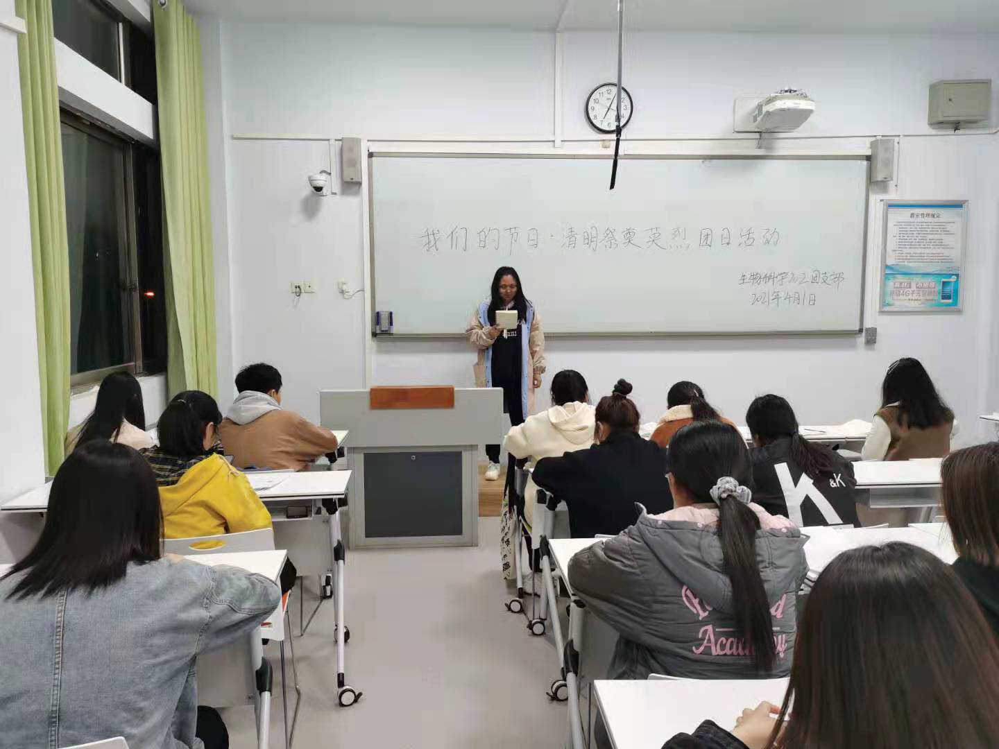 活动伊始,由团支书及组织宣传委员提前在班里发布了本次活动的主要主旨,让同学们提前做好了活动准备。接着,团支书先上台宣读此次活动的目的和意义,然后请同学们依次上台分享自己在观看有关祭奠英烈的视频的心得感悟。经过同学们的发言,现场的氛围活跃到了一个新程度,我们进行了自由交流环节,环节中大家展开了激烈的讨论,互相谈着自己了解的革命先烈的英雄事迹和艰苦卓绝的奋斗历程,感受的战争年代炮火的洗礼和可歌可泣的红色精神。同学们互相交流,气氛十分融洽,最后团支书总结发言。