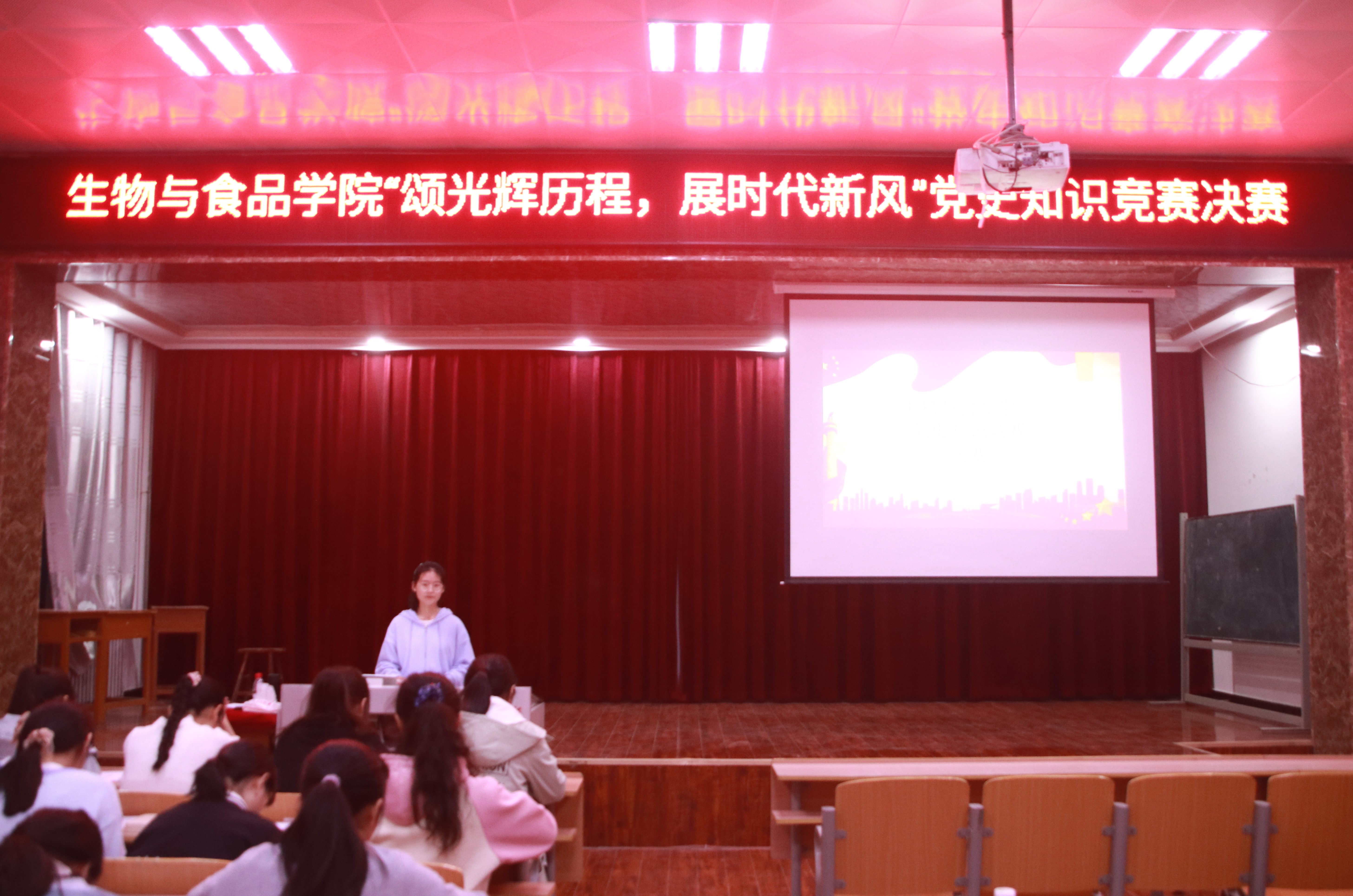 为庆祝中国共产党成立100周年,丰富同学们的课余生活,培养同学们的爱国主义情怀,营造良好的学习氛围,使同学们树立正确的价值观,生物与食品学院于2021年4月13日在报告厅举办“颂光辉历程,展时代新风”主题党史知识竞赛。生物与食品学院学生积极参加了此次活动。