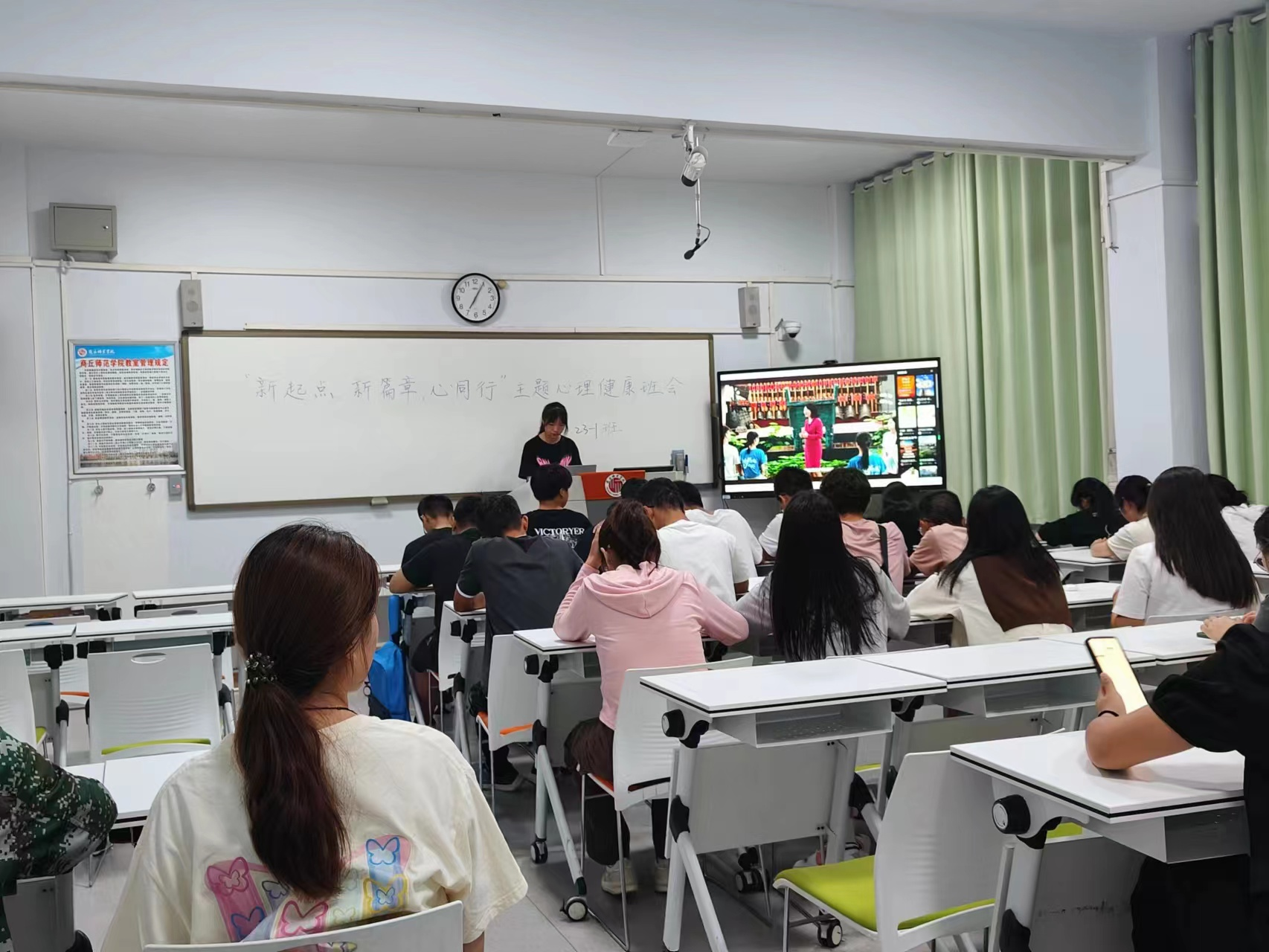 为进一步加强我院大学生心理健康素养,帮助2023级新生形成正确的世界观与人生观,提高其心理调适能力,助力大学生尽快适应新学期,9月18日晚,我院2023级辅导员刘海滨和心理健康教育联络员丁蓓,组织全体新生以班级为单位收看学习“新起点 新篇章 心同行”主题心理健康公开课,并借此契机召开开学第一节心理主题班会,增强学生对学校、对班级的归属感,提升对新学期的期待和信心。