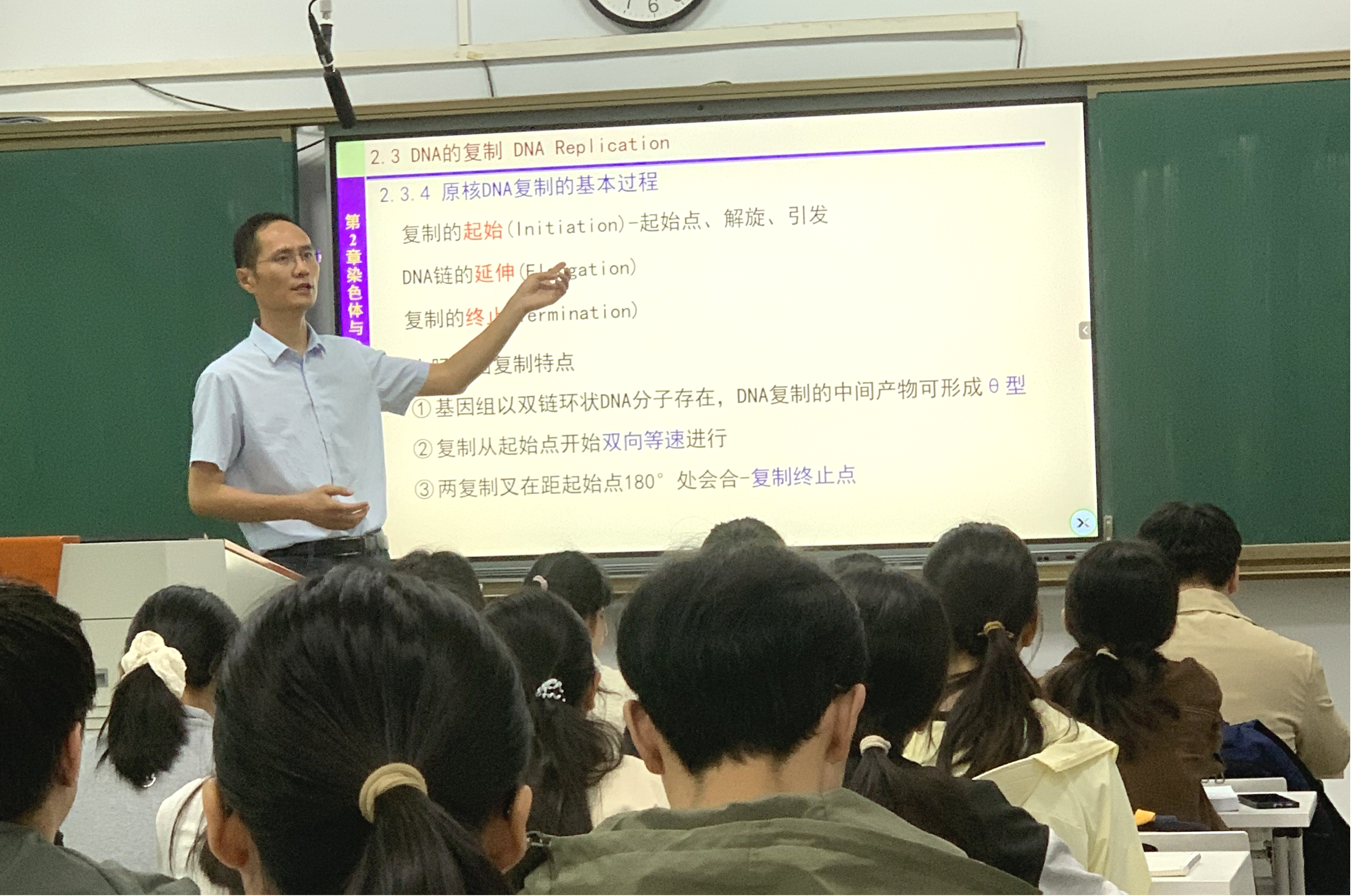 本次公开课讲授的是《分子生物学A》第2章第3节DNA的复制。张庆琛老师采用“线上+线下”混合式教学模式, 依托“学习通”平台自建课程提供的视频、主题讨论、作业,帮助学生完成预习和课后复习。线下课堂基于线上问题导入新课,正课以启发式、DNA的复制视频等引导学生共同解决重难点内容,并做好归纳总结和课后拓展。