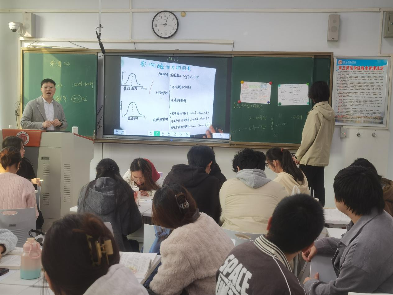 2025年10月28日上午,生物与食品学院张辽老师在睢阳校区1号教学楼406教室举行了《动物生物化学》教学公开课。生物与食品学院郭艳教授、席丽副教授、洪一峰、陈冠华、张会军博士等教师莅临现场观摩指导。