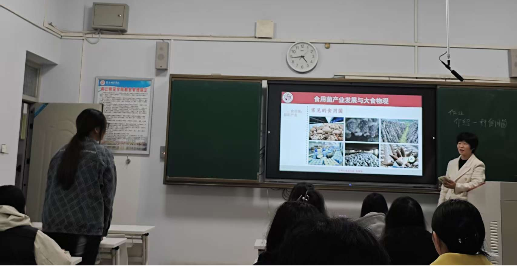 2025年11月6日下午,生物与食品学院生物工程专业朱晓琴副教授主讲的《食药用菌生产工艺学》课程教学范式综合改革公开课在睢阳校区1号教学楼413教室进行,课题是“食用菌产业发展与大食物观”,主要内容为食用菌营养价值与药用价值、食用菌产业发展现状。生物工程多位老师观摩了此次公开课,生物工程专业2024级同学参加了公开课。