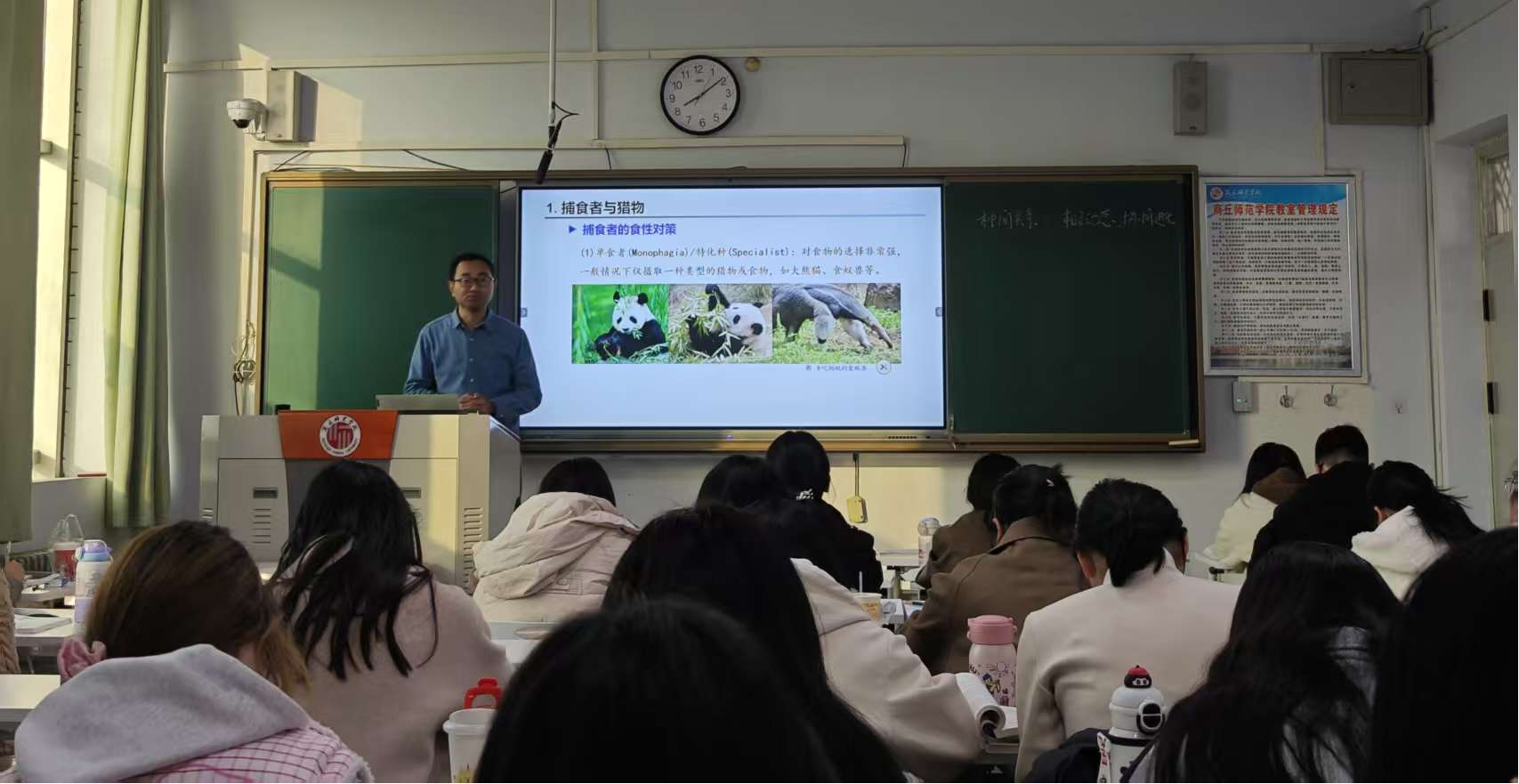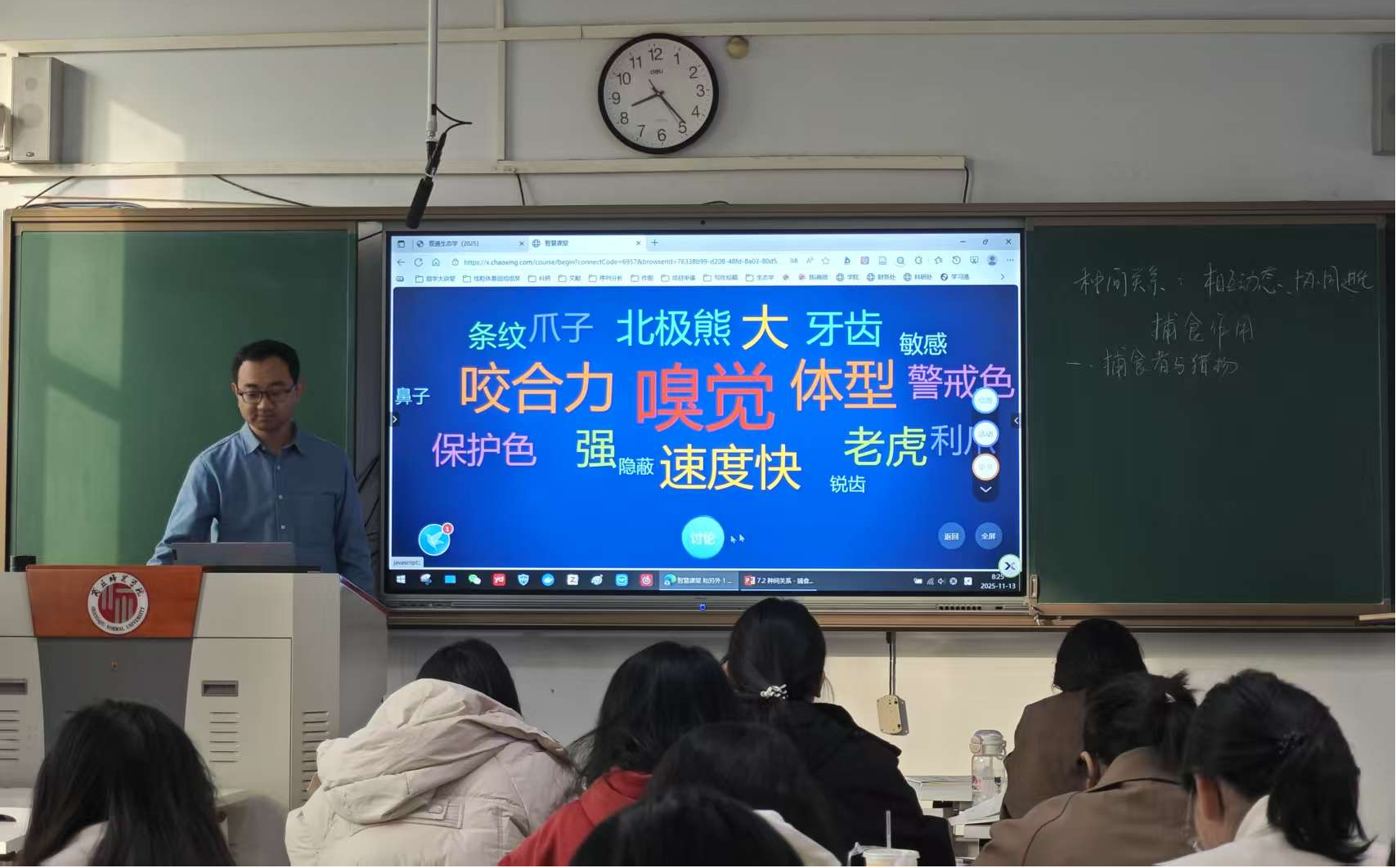 2025年11月13日下午,生物科学专业钟华明老师于1号教学楼406教室举行了《普通生态学》公开课教学观摩活动,系主任郑爱珍及同行教师杨杰莅临现场进行观摩。
