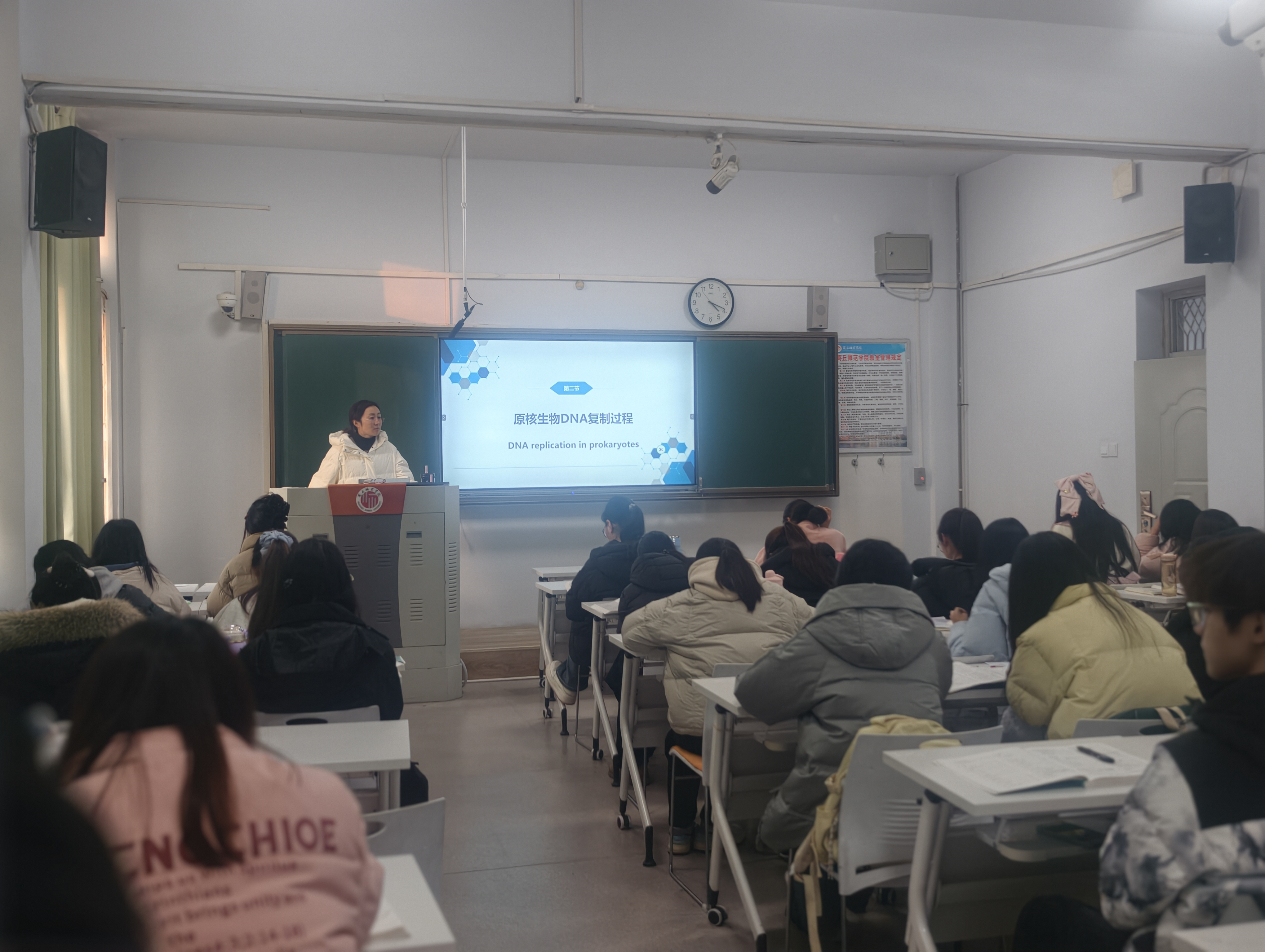 本次课,王文静老师讲授了“原核生物的DNA复制”的内容。课程从复制起点与复制叉的结构入手,以关键科学问题为线索,引导学生深入思考并探讨DNA半保留复制、冈崎片段等核心机制,在互动中深化了对复杂生化过程的理解。讲解中,王老师通过剖析DNA聚合酶的精准校对功能,强调了科学探索所需的严谨态度。同时,她结合我国在合成生物学与生物技术等前沿领域的战略布局,向学生阐释了生命科学研究紧扣国家发展需求、保障生物技术安全的重要性,实现了专业知识传授与价值引领的有机结合。